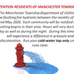The Manchester Township Department of Utilities will be flushing fire hydrants between the months of April and May 2026. Each community will be notified when flushing begins in their area. Hours will vary during the day as well as during the night. During this time, you will experience a difference in pressure and discoloration. Run your cold-water tap only until it runs clear.