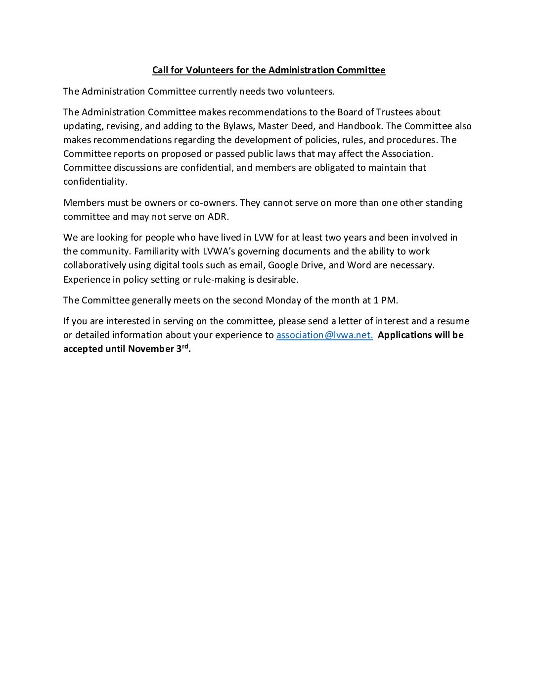 We are looking for people who have lived in LVW for at least two years and been involved in the community. Familiarity with LVWA’s governing documents and the ability to work collaboratively using digital tools such as email, Google Drive, and Word are necessary. Experience in policy setting or rule-making is desirable.