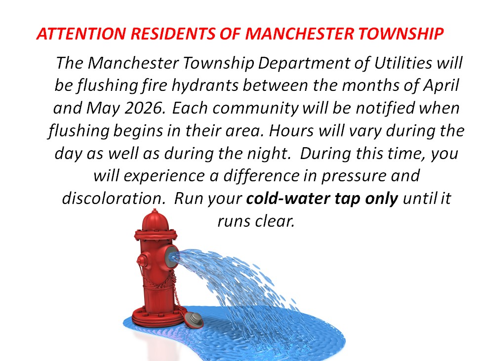 The Manchester Township Department of Utilities will be flushing fire hydrants between the months of April and May 2026. Each community will be notified when flushing begins in their area.