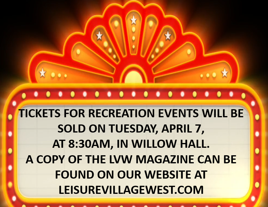 Tickets for trips and events advertised in the April issue of the Leisure Village West News will go on sale on Tuesday, April 7th, at 8:30 a.m. in Willow Hall.