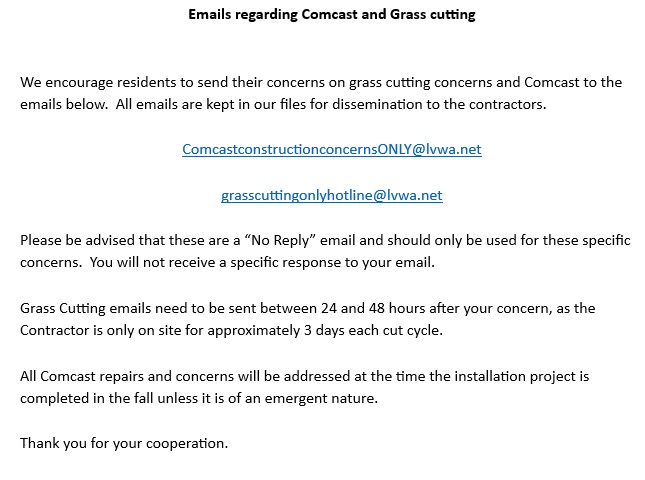 Just a reminder to everyone that you can send your concerns on any damages from the Xfinity installation to the email below. As per the response on the email below,