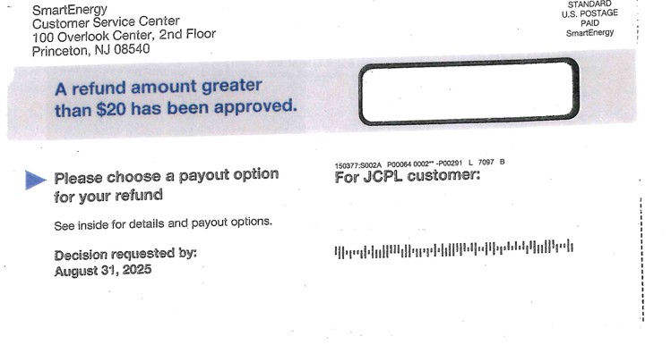 Please be aware of a mailing from Smart Energy regarding a refund for JCP&L cutomers. Smart Energy is a third party supplier, and if used will double your electric bill.