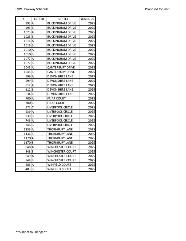 The proposed schedule for driveway replacements in 2025 is attached to this announcement. Please note that this list is subject to change.