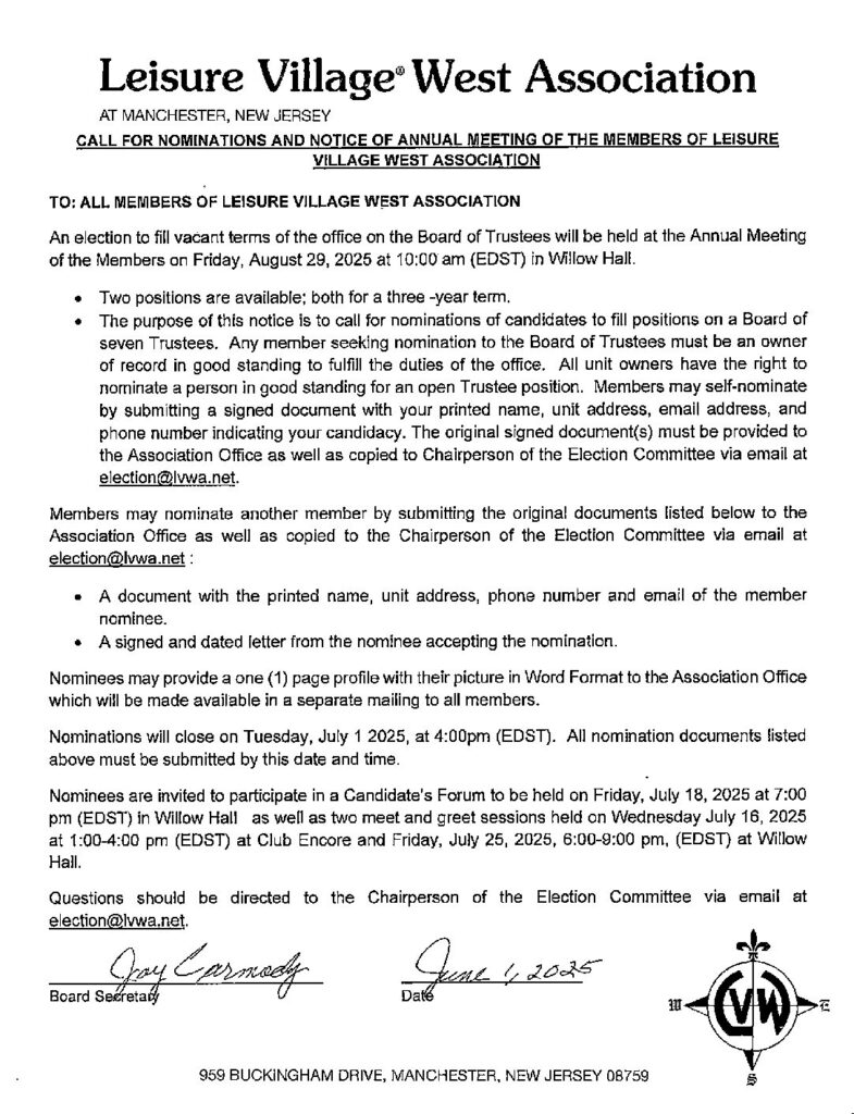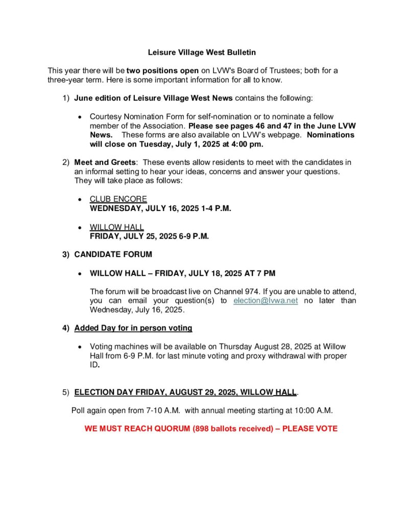 This year, two positions will be open on LVW’s Board of Trustees, both for a three-year term. Here is some important information for all to know. 1) The June edition
