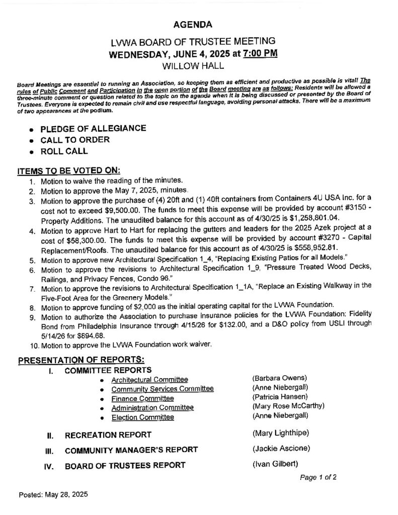 An open Board of Trustees meeting will be held on Wednesday, June 4, 2025, at 7:00 p.m. in the Auditorium at Willow Hall. Following the business portion of the meeting,