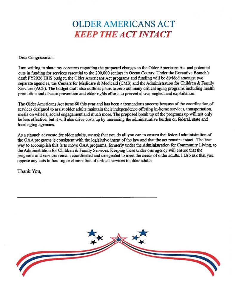 The Mayor’s Office at Manchester Township has provided the attached sample letter to Congress addressing concerns regarding the Older Americans Act. If interested, it is also available in Willow Hall