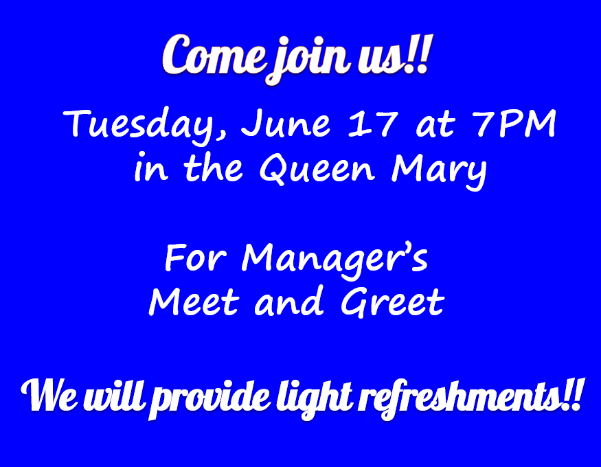 Come Join Us! Tuesday, June 17, at 7pm in the Queen Mary for Community Manager’s Meet and Greet. We will provide light refreshments.