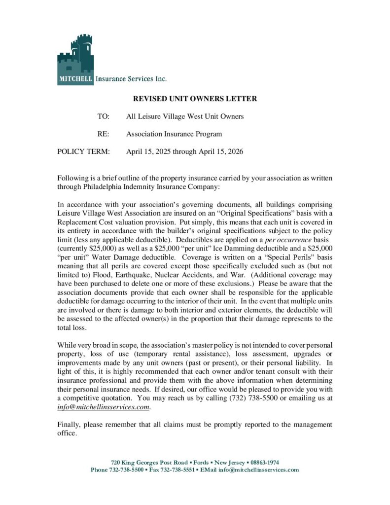 Please see the attached for an updated copy of the LVW Insurance Unit Owner Letter stating that all deductibles are $25,000.00.