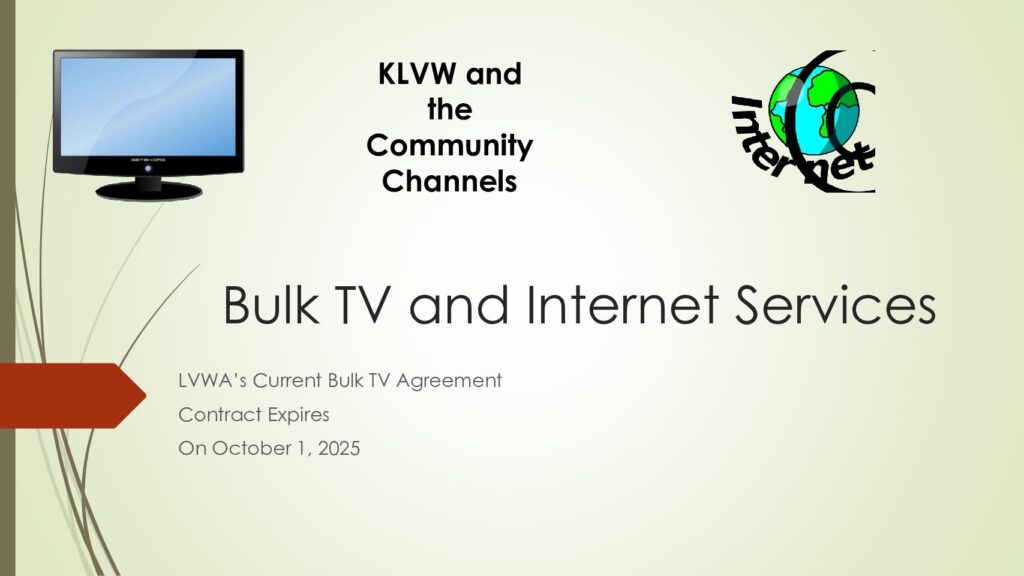 Attached is the PowerPoint presentation from the open Board meeting on April 2, 2025, regarding the comparison of bulk TV and internet proposals. A survey will be sent out soon.