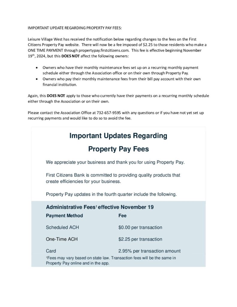IMPORTANT UPDATE REGARDING PROPERTY PAY FEES: Leisure Village West has received notification (see attached) regarding changes to the fees on the First Citizens Property Pay website. There will now be