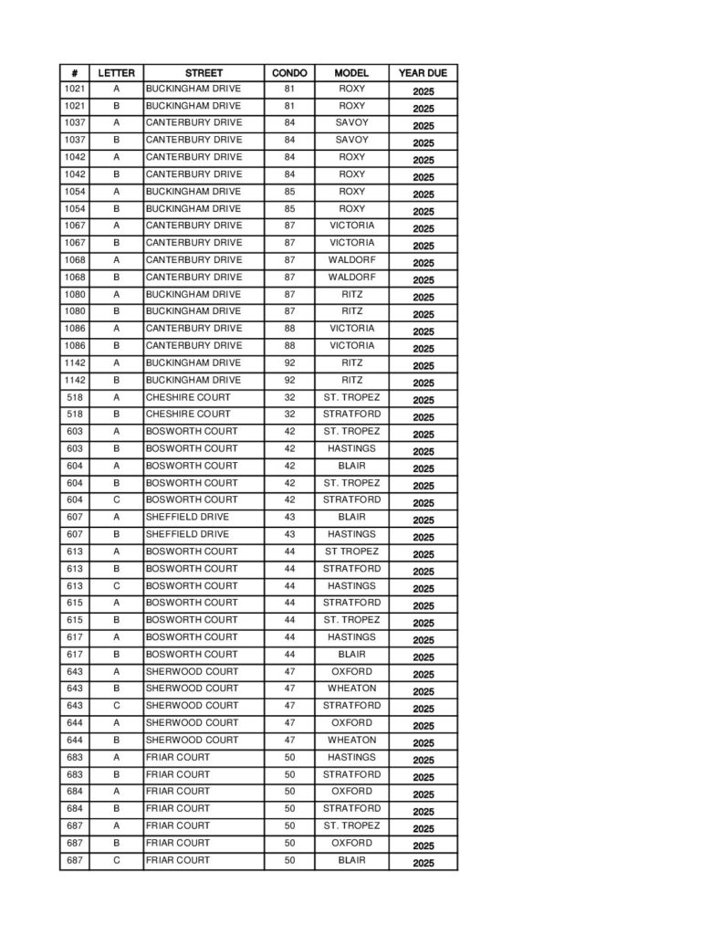 Attached is the Roofing Replacement Schedule for the homes in the community. This tool helps us create the roof-replacement schedule for each year. Please note that this schedule changes often