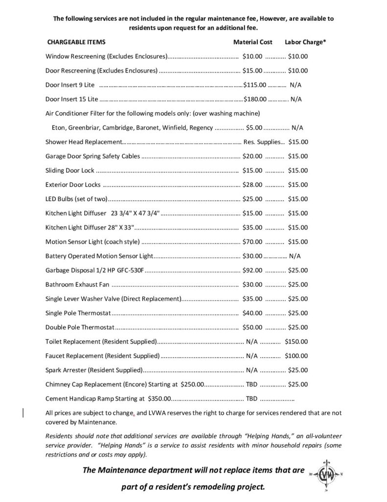 The updated Chargeable Items list for Maintenance is attached. Chargeable items are services the Maintenance Department provides for a charge not covered under the regular maintenance services. Any already scheduled […]