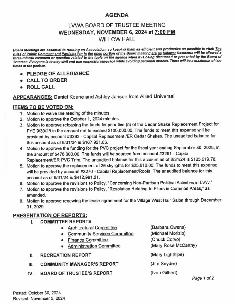 An open Board of Trustee meeting will be held on Wednesday, November 6, 2024, at 7:00 p.m. in the Auditorium at Willow Hall. After the business portion of the Board
