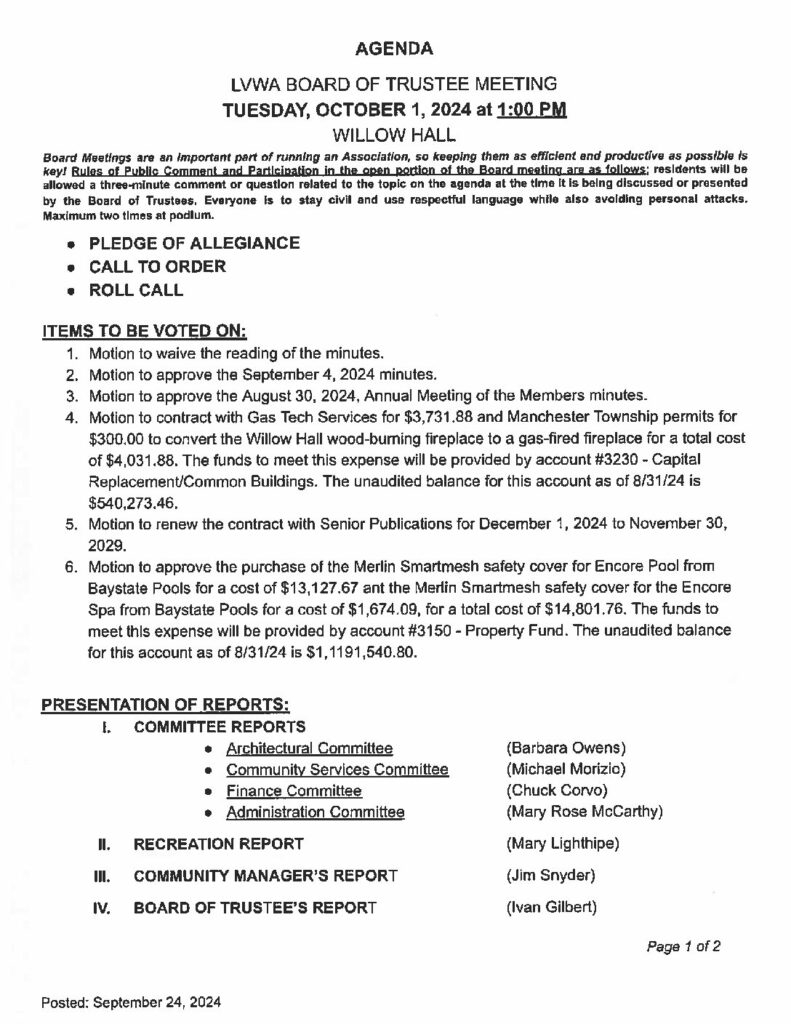 There will be an open Board of Trustee meeting held on TUESDAY, OCTOBER 1, 2024, at 1:00 p.m. in the Auditorium at Willow Hall. After the business portion of the