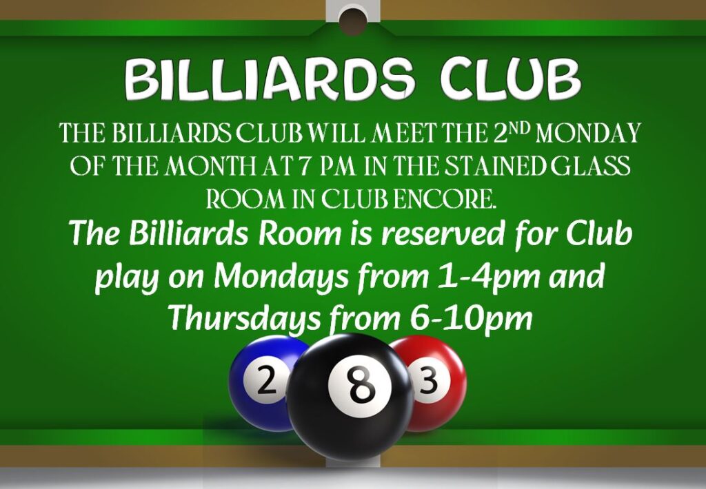 Billiards Club *NEW SCHEDULE*Club Newsletters / Site Admin Please see attached for details. Billiards Club *NEW SCHEDULE* Read More »