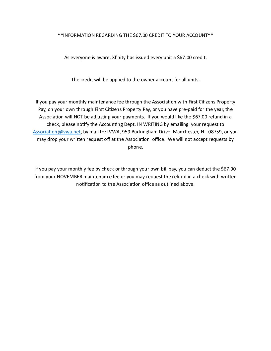 INFORMATION REGARDING THE $67.00 CREDIT TO YOUR ACCOUNT