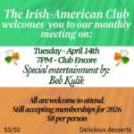 IRISH AMERICAN CLUB – APRIL 2026By Site Admin / April 8, 2026 Please see the attached for further details.
