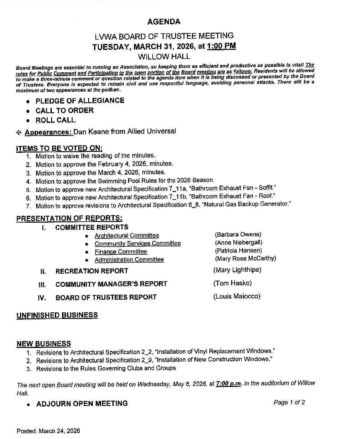 An open Board of Trustees meeting will be held on TUESDAY, March 31, 2026, at 1:00 p.m. in the Auditorium at Willow Hall. Following the business portion of the meeting, a resident question-and-comment period will be held. The Rules of Public Comment and Participation in the Open Forum can be found on the agenda attached to this announcement. The meeting will be broadcast live on channel 1974.