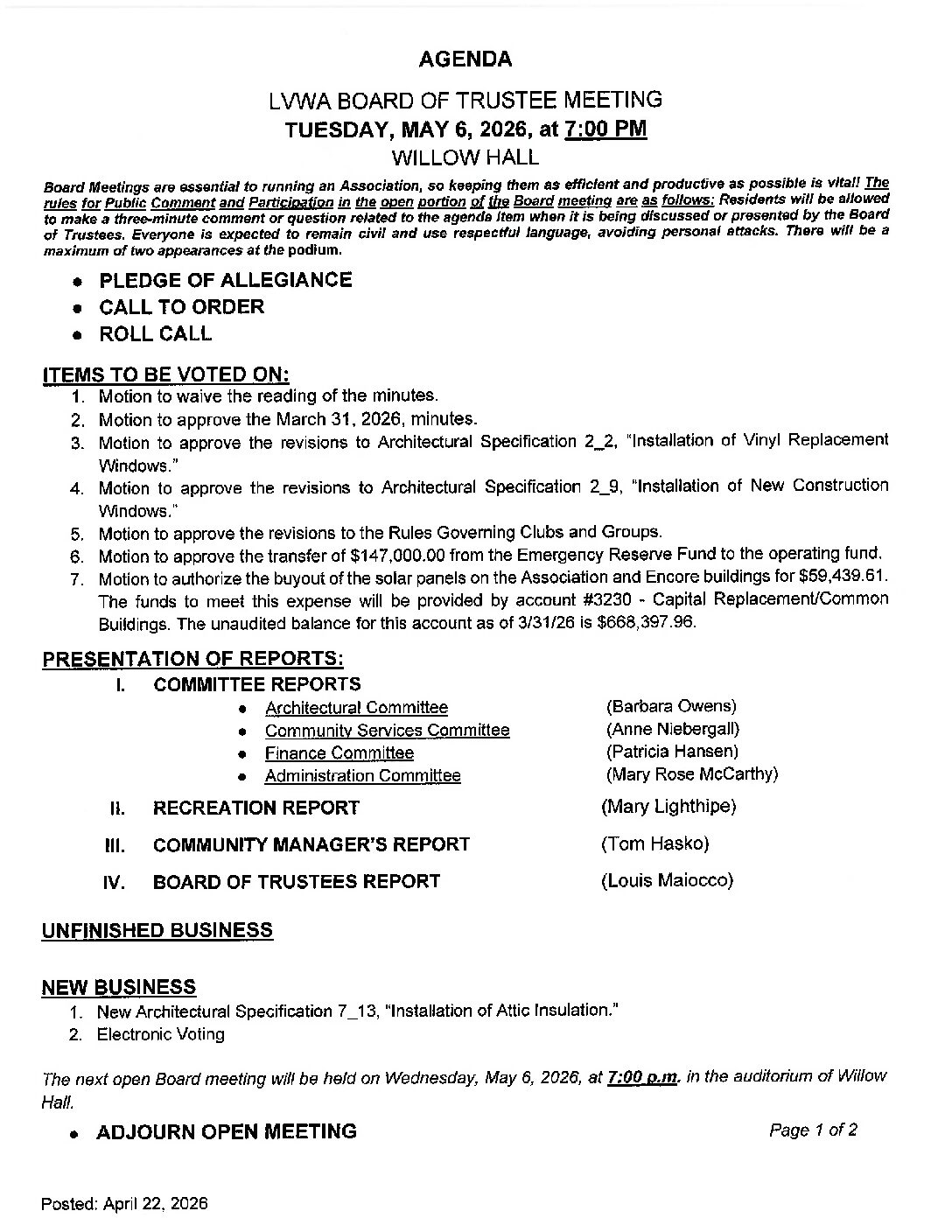 An open Board of Trustees meeting will be held on Wednesday, May 6, 2026, at 7:00 p.m. in the Auditorium at Willow Hall. Following the business portion of the meeting, a resident question-and-comment period will be held. The Rules of Public Comment and Participation in the Open Forum can be found on the agenda attached to this announcement. The meeting will be broadcast live on channel 1974.