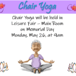 Please note that Chair Yoga on Monday, May 26th will be held at Leisure Fair – Main Room.