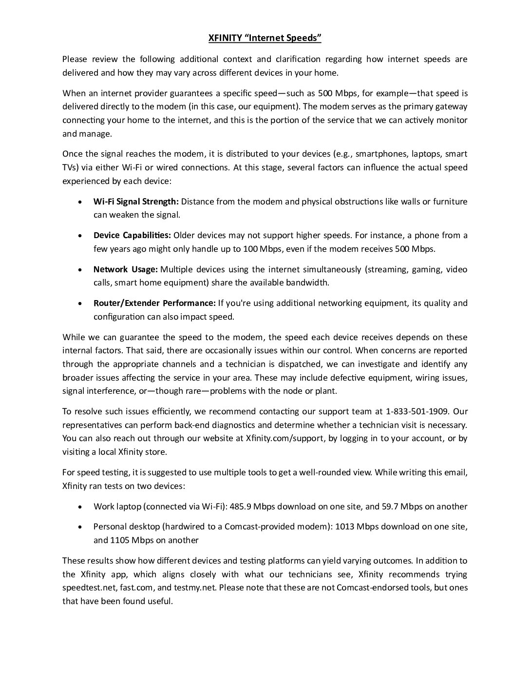 For speed testing, it is suggested to use multiple tools to get a well-rounded view. While writing this email, Xfinity ran tests on two devices: