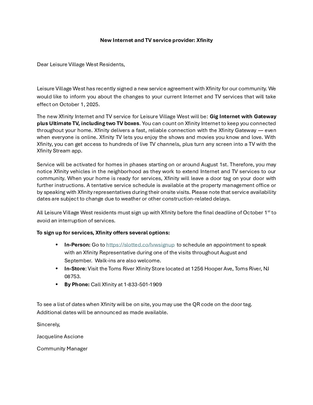 All Leisure Village West residents must sign up with Xfinity before the final deadline of October 1st to avoid an interruption of services.